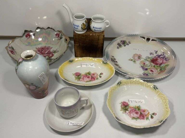 Multiple hand-painted porcelain dishes, a vase, a baby-themed mug, and a German porcelain miniature schnapps set. Items feature floral motifs, gold accents, and varying sizes. Some pieces are labeled ‘Hand-Painted.’