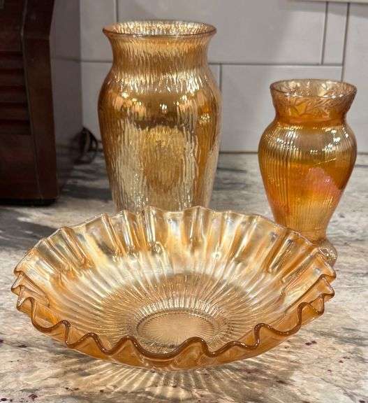 LOT 51 - Vintage Jeanette Glass Carnival Marigold Vases and Dish