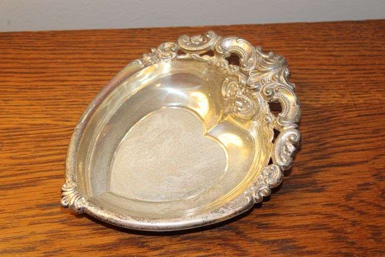 Lovely Art Nouveau sterling silver heart form bowl with pierced and scrolled border detailing and shallow interior, perfect for display or serving. Please see photos for more details. In overall good condition with finish wear. No other items included.