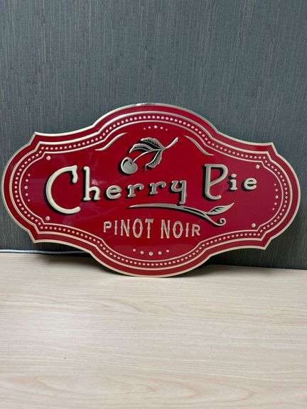 Cherry Pie Pinot Noir decorative metal sign featuring a red and gold design with embossed details. The sign measures approximately 12 inches in height and 24 inches in width. No visible damage or markings noted beyond the design. Suitable for display purposes. This item(s) sells as is...