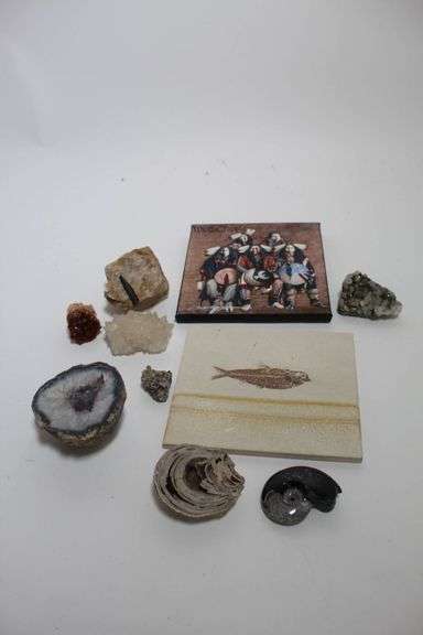 Collection includes a signed "We The People" print featuring Revolutionary War imagery and a selection of fossils and geodes. Fossil types include a fish fossil, ammonites, and a variety of mineral specimens. The print measures 9"w 9"h. The fish fossil plaque is slightly larger than 9"w. Fossils range in size, with some geodes approximately 4"w to 5"w.