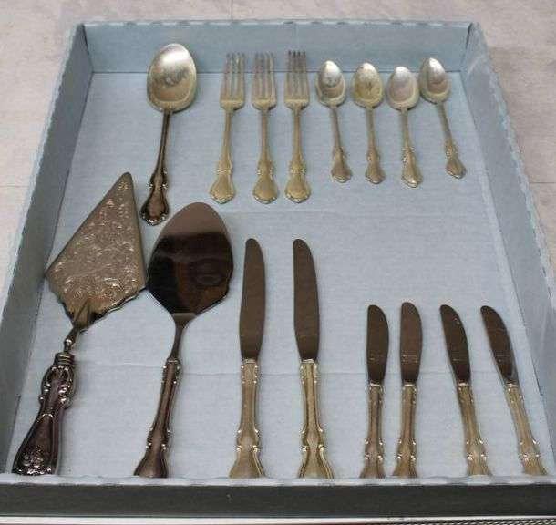 Reed & Barton flatware set, including knives, forks, spoons, and serving utensils. Sterling silver is marked on select pieces, as shown. Weight of sterling flatware is 374g as displayed on scale. Non-sterling pieces feature stainless steel blades and weighted sterling silver handles. Please see the photos to help determine the condition and the value for yourself. Sells as is.