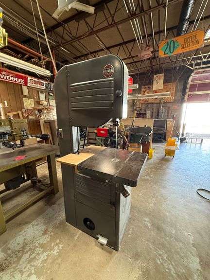 Heavy-duty upright bandsaw with solid metal table and storage base. Untested, appears complete.