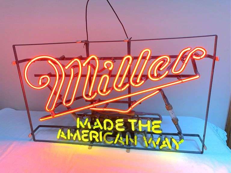 Vintage 80’s Miller neon sign. Miller made the American way. Super nice! Works - some letters may not be fully illuminating. 3 prong plug. Has that neon buzz when lit up. Larger sized, measures: 26” x 16” x 8”.