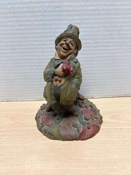 This hand-painted figurine, created by renowned artist Tom Clark, is a charming addition to his collection of whimsical sculptures. Featuring intricate details and lifelike colors, this piece showcases a character standing on a textured base adorned with natural elements including leaves, berries, and small carved accents. The figurine is signed on the base by Tom Clark and includes a visible copyright date of 1987. It is also numbered 1192, adding to its collectible appeal as a limited edition. | | The figurine stands approximately 6 inches tall (see photos for measurements). No visible chips, cracks, or significant damage are found, though minor wear consistent with its age is present. The base is finished with a felt bottom to prevent surface scratching. | | Please note the artist's signature as seen on the base, in addition to the copyright marking, both of which highlight the authenticity and historical significance of the piece. This item sells as is...