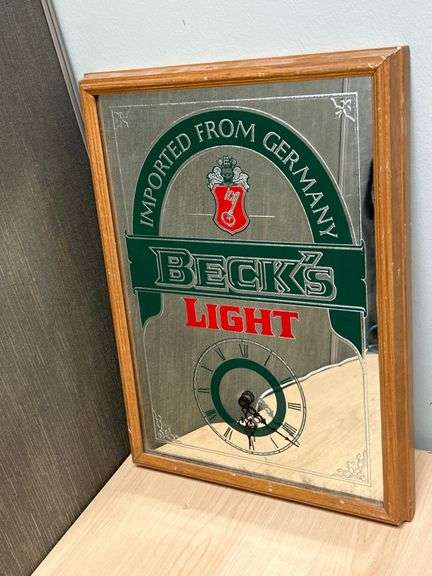 This is a mirrored wall clock promoting Beck's Light beer, featuring a prominent 'Imported From Germany' text with the Beck's crest in green, red, and white accents. It is framed in natural-toned wood and manufactured in the USA by Beeco MFG, as indicated on the back panel. The cardboard sheet attached to the back bears the manufacturer's details: Dribeck Importers, Greenwich, CT 06830. The battery-operated clock mechanism is intact and set beneath Roman numerals displayed on the mirrored glass. The item includes visible hanging hardware for mounting. Measurements are shown in the included photos; see photos for details. The clock body shows minor scratches from age and handling, with no evident cracks or structural damage. This item sells as is...
