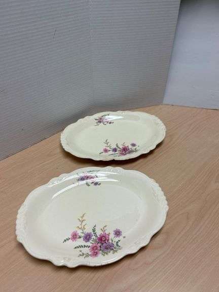 This is a set of two platters by Homer Laughlin, part of the Virginia Rose collection. Both platters feature a floral motif of pink and purple flowers with light green leaves and embellishments around the edges. Markings on the bottom of the items read "Homer Laughlin Virginia Rose Made in U.S.A. C 4 8 N 8" and "C 47 N 8," providing traceability to the maker and production details. See photos for measurements, as they are provided for reference. | | Condition report: Both platters exhibit some wear consistent with age and use. There is noticeable damage including chips to the edges on one platter as shown in photos. Age-related discoloration and wear marks are visible, particularly on the edges and underside of the items. | | This item(s) sells as is...