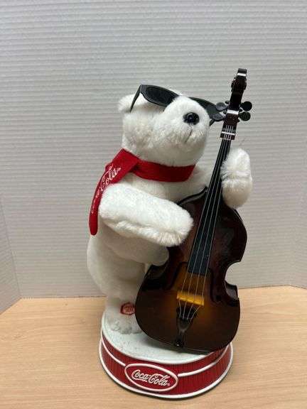 This listing features a Coca-Cola animated polar bear plush holding a cello, standing on a branded Coca-Cola base. The plush is adorned with a red Coca-Cola scarf and sunglasses. A trademark tag inside the plush reads: 'Coca-Cola brand ANIMATION by The Coca-Cola Company. All Rights Reserved.' This animated figure is battery-operated, with an accessible battery compartment visible on the base. Measurements of the item can be seen in the photos. The overall design and branding highlight Coca-Cola’s iconic style. The item appears to have no visible damage and seems to be in good condition, with functionality as per the operational battery feature. This figure showcases a delightful blend of animation and memorabilia with a strong connection to Coca-Cola's beloved polar bear branding. This item(s) sells as is...