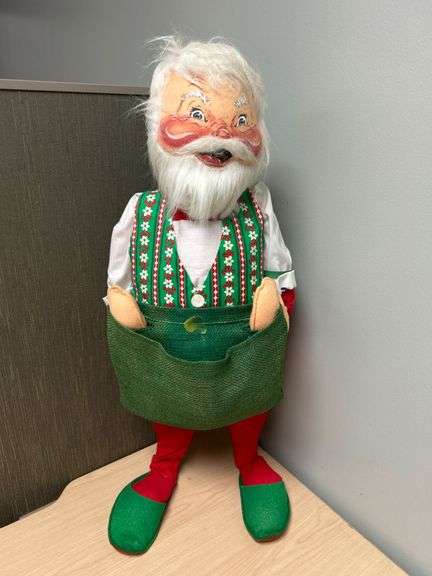 This is a 1983 festive Christmas doll by Annalee, as indicated by the tag located on the leg which reads 'Annalee Mobilitee Dolls, Inc., 1983, Meredith, N.H., U.S.A.'. This handmade doll features a cheerful elf design adorned in vibrant holiday attire, including a red and green outfit with a patterned vest decorated with flowers and berries. The doll is holding a green fabric bag. The doll stands approximately 27 inches tall (see photos for measurements). Upon close inspection, some glue residue is visible on the green bag near the hands, and the face shows signs of wear, including minor discoloration and fading. No additional damages or repairs can be seen. Please review all pictures closely to assess the overall condition. | | This item(s) sells as is...