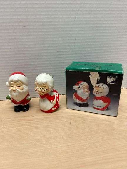 This lot includes a ceramic Santa Claus and Mrs. Claus salt and pepper shaker set, accompanied by its original box. The Santa shaker features a cheerful standing posture, while Mrs. Claus is seated in a red dress with green accents. Both shakers are marked 'Made in Japan' on the bottom, ensuring their origin. The box itself is marked 'Made in Taiwan' and bears the title 'Ceramic Santa Claus Salt & Pepper,' with some wear visible on the exterior. | | See photos for measurements; approximate height of the items is about 3 inches. The Mrs. Claus shaker shows notable paint wear on the red areas, specifically her dress and accessory details, exposing the white ceramic beneath. The box also has signs of wear, including a dent and visible tears. | | This item(s) sells as is...