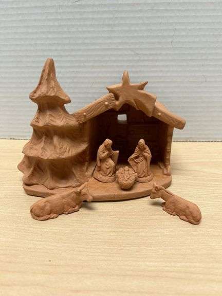 This terracotta nativity scene features a beautifully designed depiction of the birth of Jesus, complete with a stable, a tree, and a prominent star above the structure. Included in this set are the figures of Mary, Joseph, the baby Jesus in the manger, and two lying animals, all crafted with detailed terracotta work. The stable itself showcases a textured representation of stone walls and a slanted roof. Visible measurements are noted in the photos for size reference. At the bottom of the stable, additional details of the unfinished texture are available, emphasizing its handmade craft. Please note that no specific markings or maker's details were found on this piece. Wear and minor imperfections are present as seen in the photos, including scuff marks and a small chip visible on the back edge. This piece offers a charming and timeless scene, perfect for collectors. This item(s) sells as is...