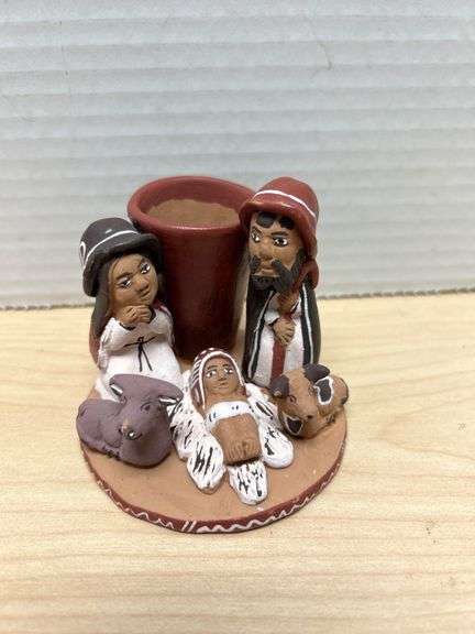 This unique handcrafted Nativity scene depicts the Holy Family – Mary, Joseph, and Baby Jesus – accompanied by two animals, placed in front of a cylindrical candle holder. The piece is marked 'Made in Peru' on the underside and showcases artistry that reflects Peruvian craftsmanship. The measurement is approximately 3 inches in height (See Photos for measurements). This piece is made of clay or similar material, adding a rustic and earthy touch to the design. There are no visible cracks or chips noted on the item according to the provided photos. The attention to detail in the sculpting and painting makes it a striking representation of the Nativity. This item is a meaningful representation of faith and tradition. This item(s) sells as is...
