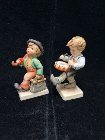 This lot features two collectible Goebel Hummel figurines crafted in West Germany. Included are "Trommler" (Little Drummer) and "Merry Wanderer" known for their intricate details and hand-painted finishes. Both figurines bear clear markings on their bases. The bottom of the "Trommler" figurine includes the Goebel, Germany stamp with a 1955 date, the mold number "73 2/0," and "Trommler Little Drummer" label. The "Merry Wanderer" showcases the Goebel West Germany stamp, with mold number "11 2/0" and label "Merry Wanderer." The bases are further marked with signatures and production details. | | There appears to be a small chip on the base of "Merry Wanderer," visible near the label. See photos for measurements and close-ups of markings. | | These items sell as is...