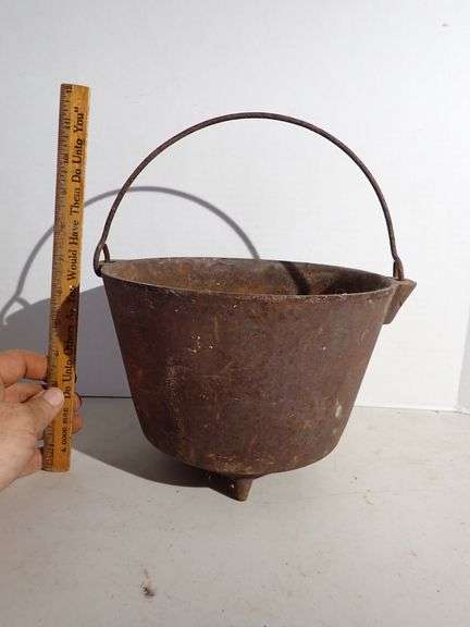 LOT 103 - Deep Cast Iron Three Foot Cauldron with Handle - Solid condition - ready to restore & season!